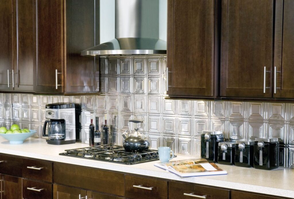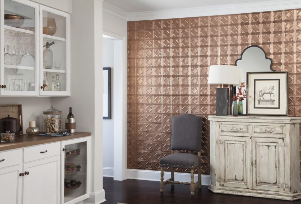 El brillo del muro de realce de metal crea un punto focal dramático en un diseño de sótano elegante. Los paneles de metal prensado para el muro del sótano se comercializan en acabados de lujo, incluida la calidez del cobre y el latón junto con la sofisticación elegante del acero laqueado.