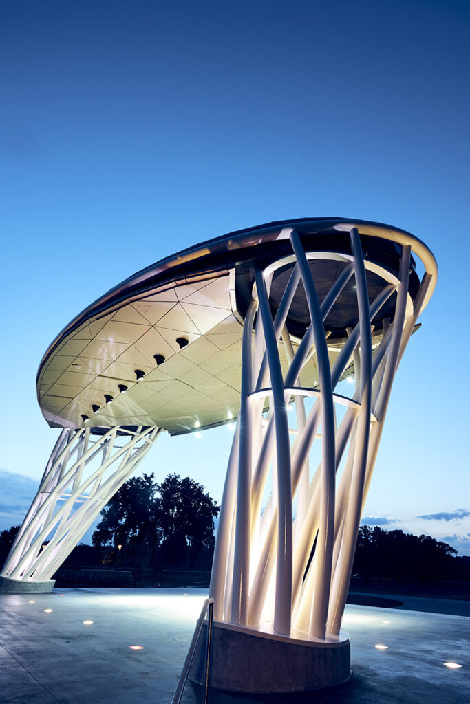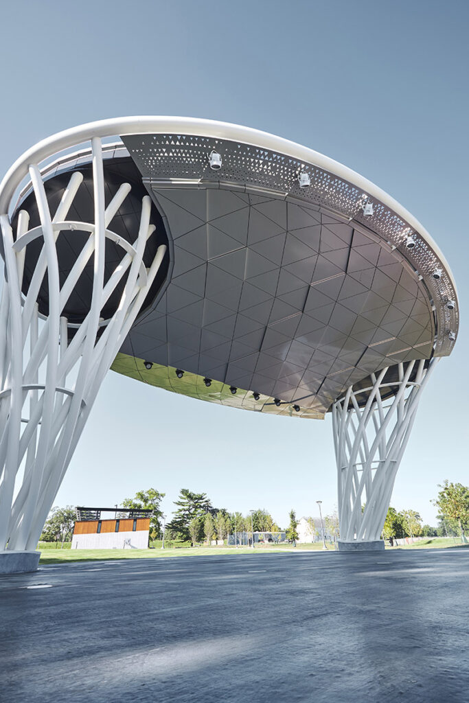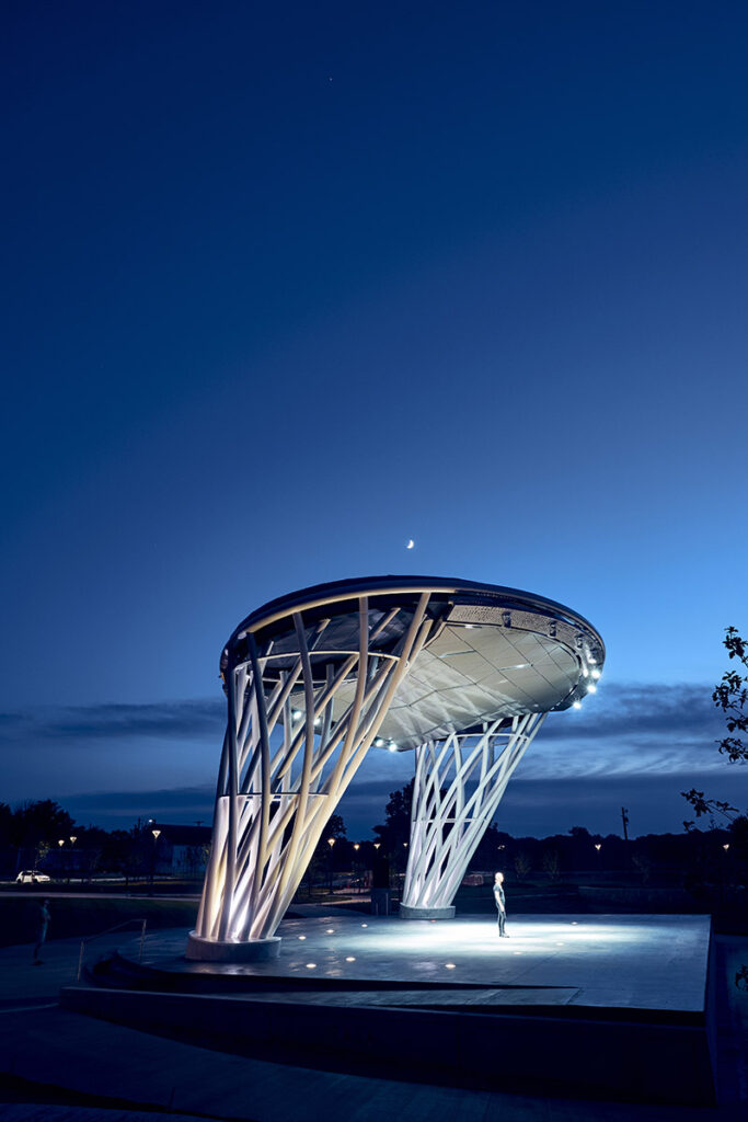 “Nuestra directiva era proporcionar un anfiteatro escultórico que se destacara como una característica icónica dentro de un parque de nuevo diseño que activaría a la comunidad para participar en juegos o caminatas recreativas a lo largo de caminos serpenteantes”, dijo Jessen. “Llegamos a nuestro diseño siguiendo los movimientos orgánicos realizados por el equipo de paisajismo y, además, expresando una estructura emblemática del arboreto adyacente al anfiteatro. Verá la estructura del anfiteatro girar y formar un tejido de tubos similar a la forma en que crecen las ramas de un gran roble para sostener un dosel de hojas en el verano».