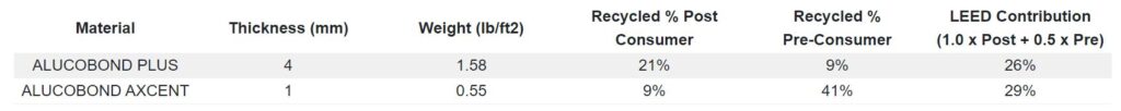 Materiales y recursos: Crédito MR 4: Contenido reciclado:Este crédito requiere el uso de materiales con contenido reciclado de modo que la suma del contenido reciclado posconsumo más la mitad del contenido preconsumo constituya al menos el 10% (basado en el costo) del valor total de los materiales en el proyecto. La contribución de ALUCOBOND® PLUS al contenido reciclado de un ensamblaje de panel ACM terminado se describe en la siguiente tabla: