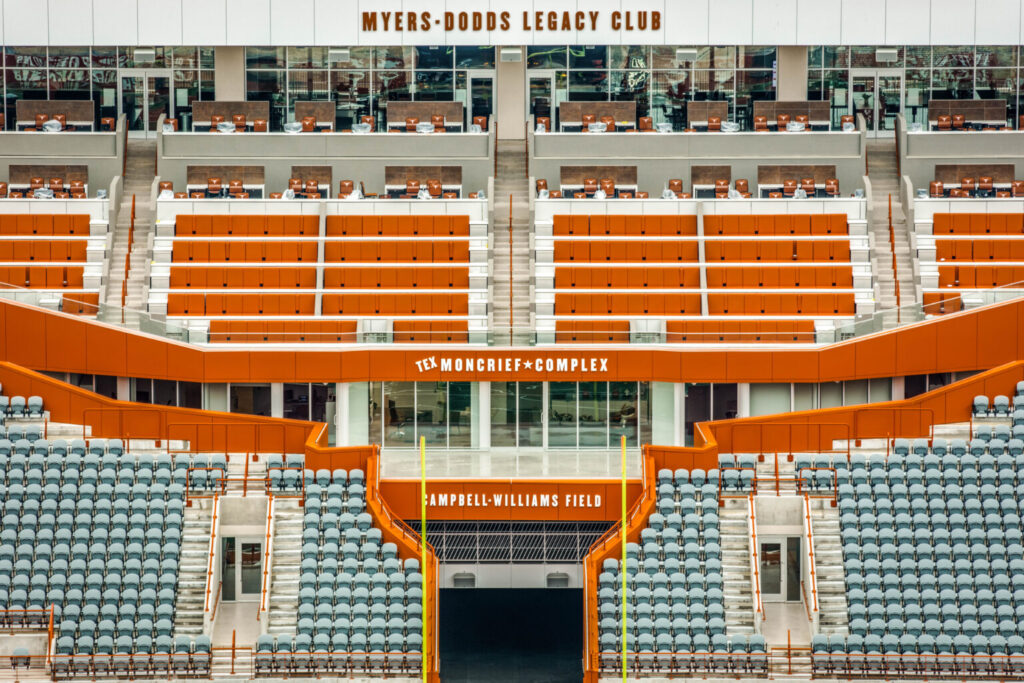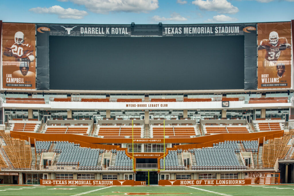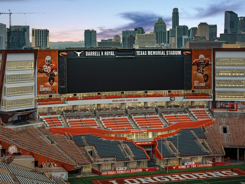 La Universidad de Texas (UT) en Austin inauguró su temporada de fútbol americano de los Texas Longhorns 2021 el 4 de septiembre al debutar su nueva expansión de la zona de anotación sur de aproximadamente $ 175 millones y 240,000 pies cuadrados, que no solo encierra completamente el Darrell K Royal-Texas Memorial Stadium sino que incluye un logotipo de equipo pionero en la industria tallado en el nuevo asiento.