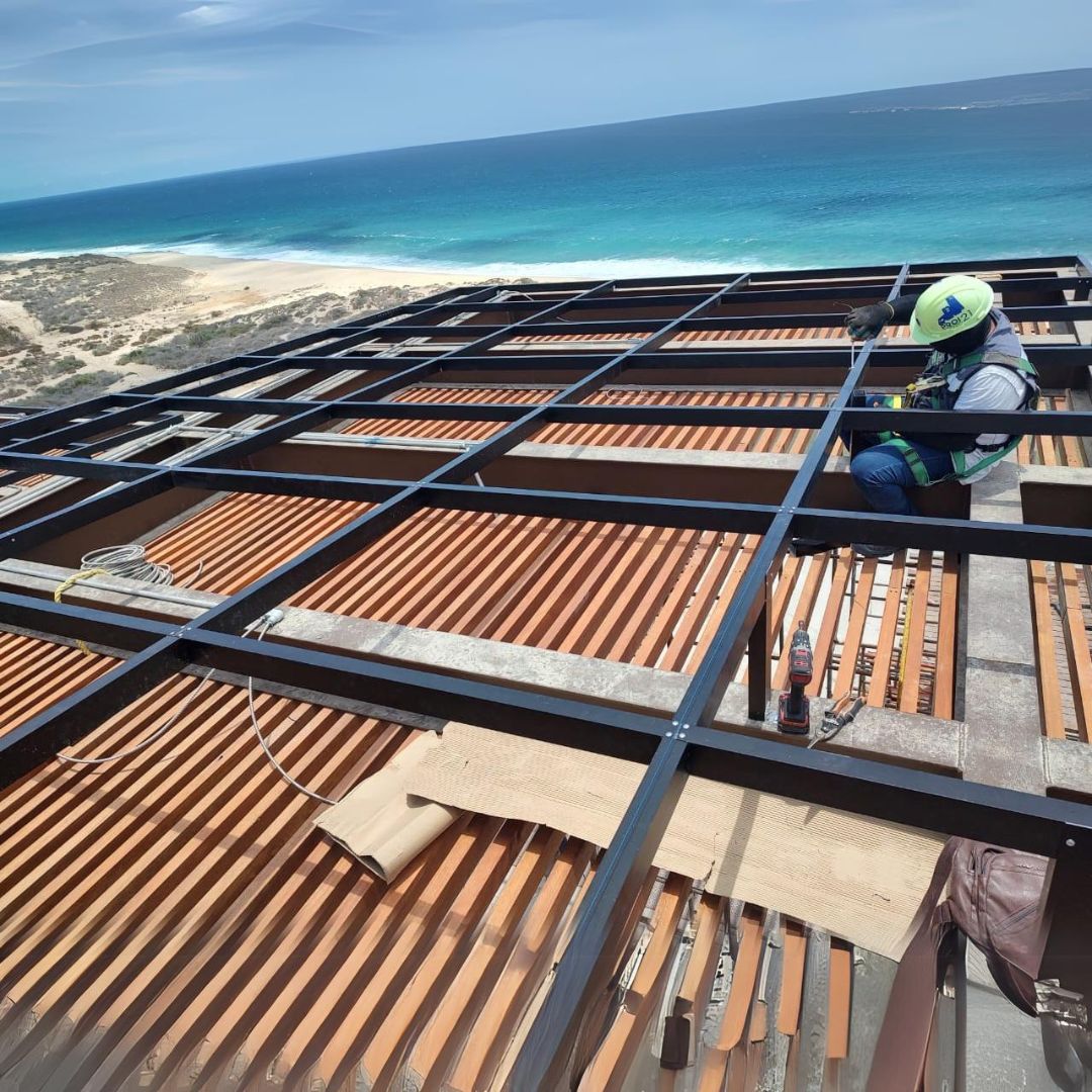 - Descripción: Instalación de cancelería interior y estructura metálica, utilizando materiales de primera calidad con tratamiento antioxidante y panel ACM en tonos Zaphire Blue y French Gray.