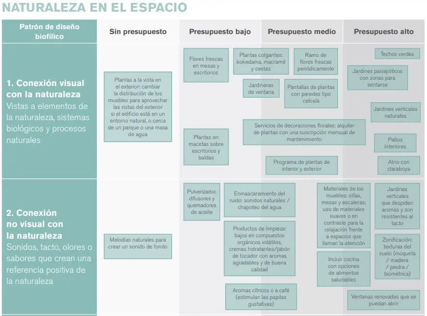 Hay un esquema muy útil de cómo aplicar las técnicas del diseño biofílico en el sector del interiorismo y la arquitectura, que además considera el tipo de presupuesto con el que cuenta nuestro proyecto.